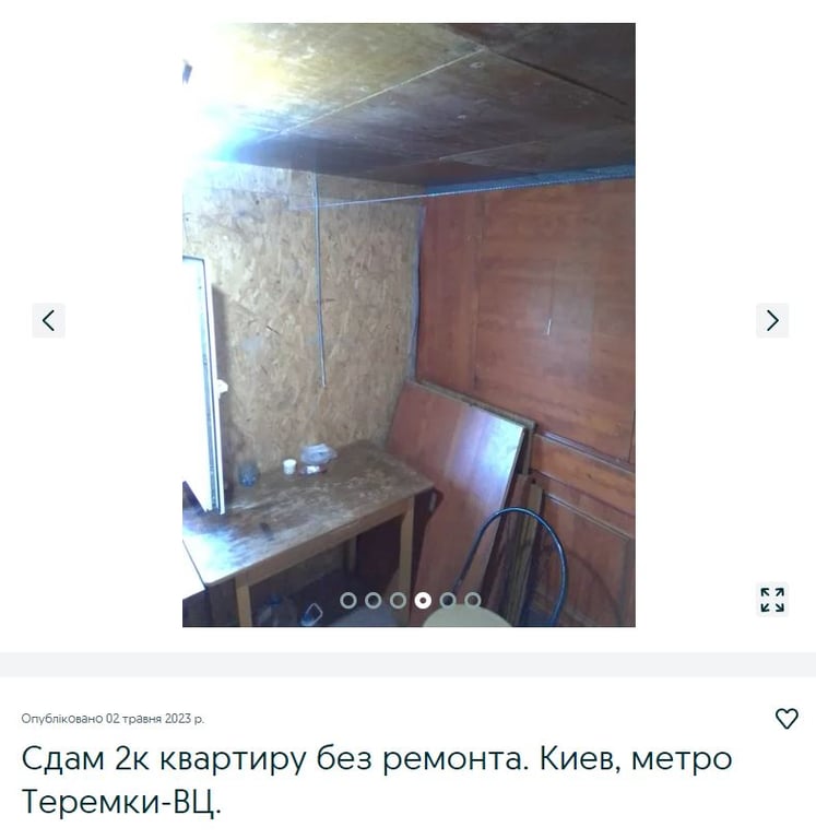 Почнемо зі столиці. Хотіли б двокімнатну квартиру в таунхаусі, з великою парковкою? Ось вона. Тільки без ремонту, водопостачання та туалету. Власник пише, що тимчасово справляти свої біологічні потреби орендарям доведеться на вулиці. Зовнішній вигляд житла — відповідний. Квартира, якщо так її можна назвати, більше схожа на комірку сторожа чи сквот безхатченків.