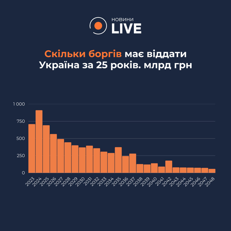 Протягом найближчих 25 років — до 2049-го — Україна має виплатити понад 7 трильйонів гривень зовнішніх та внутрішніх боргів (в еквіваленті).