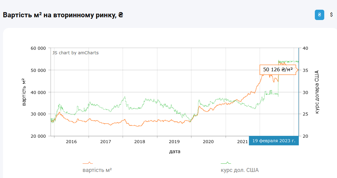 У Києві у лютому 2023 року на вторинному ринку нерухомості підвищилися ціни. Один квадратний метр у середньому подорожчав на 346 гривень, до 50,17 тисячі гривень.