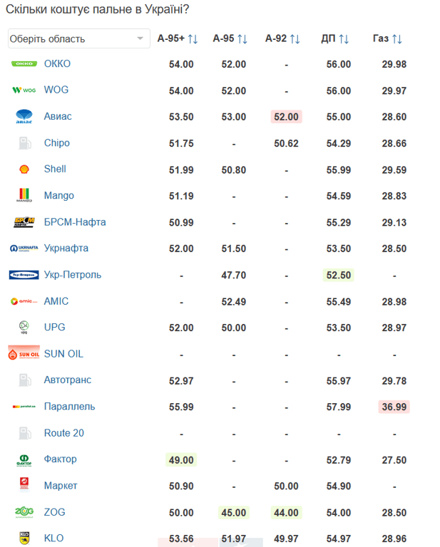 Ціни на автогаз такі: UPG (28,97 грн/л), Укрнафта (28,50 грн/л), Авіас (28,60 грн/л), KLO (28,96 грн/л).