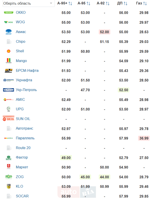 В сетях автозаправочных станций дешевле всего А-95 продают за 45 гривен (ZOG), дороже всего — за 54 гривны за литр (Neftek).
