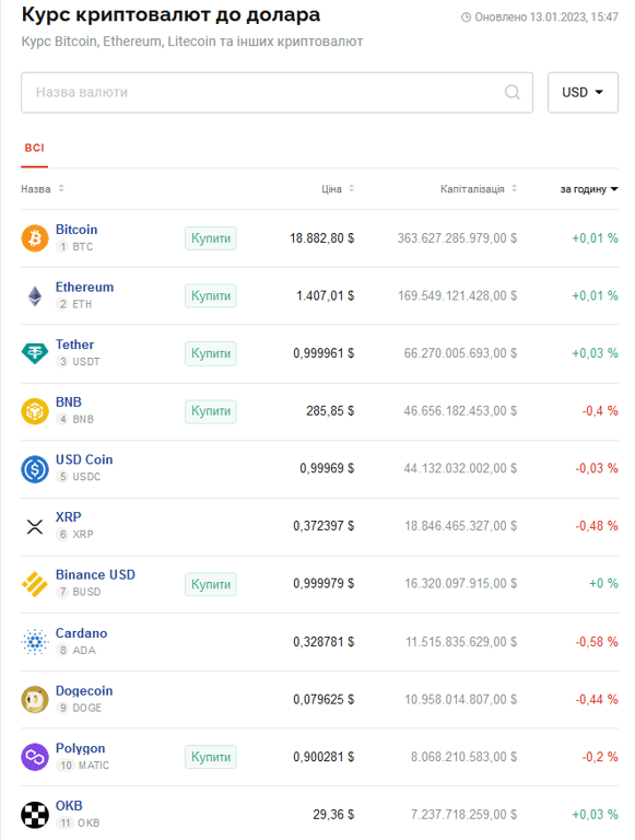 По данным биржи, Bitcoin, несколько месяцев стоивший около 16 тыс. долларов, достиг уровня в 18 880 долларов. За сутки курс прибавил 3,56%, накануне тоже вырос на 4,34%. За неделю эта популярная криптовалюта поднялась в цене на 12,17%. А за год обесценилась на 57,07% по отношению к доллару. До обвала в ноябре 2022 года ВТС стоил более 20 тыс. долларов.