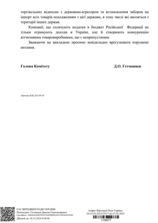 Как отметил Гетманцев, поскольку в стране до сих пор отсутствует полный запрет на импорт российских товаров, он официально обратился к правительству с требованием принять соответствующие меры.