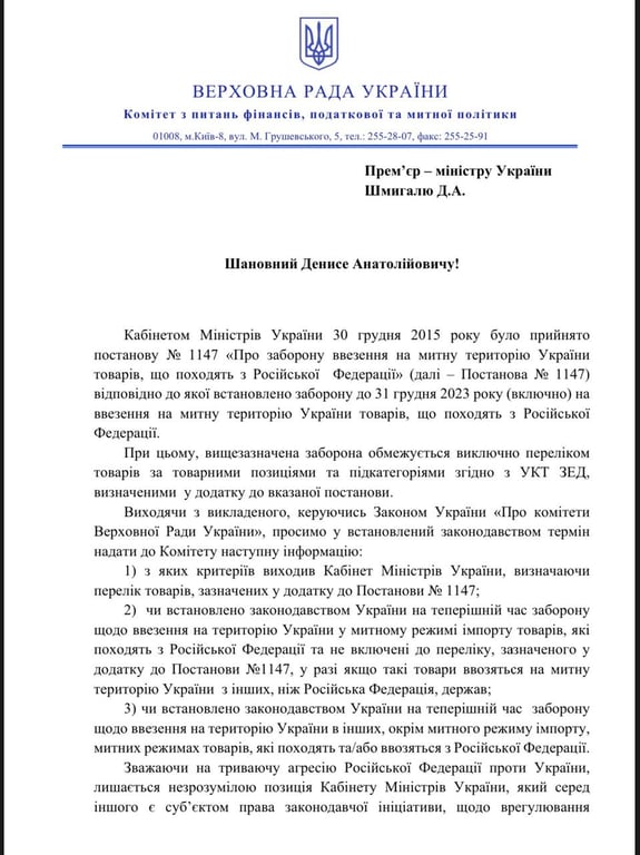 "Оказывается, до сих пор отсутствует запрет на ввоз в Украину большого количества товаров явным или скрытым происхождением из государства-агрессора через третьи страны", — отметил руководитель налогового комитета.