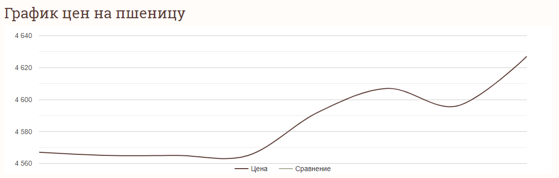 Цена на пшеницу за последние дни преимущественно росла. Так, в пятницу, 10 ноября, одна тонна пшеницы оценивалась в 4 567 грн. С тех пор стоимость как росла, так и падала. Так, в период с субботы, 11 ноября, по понедельник, 13 ноября, стоимость одной тонны пшеницы упала до 4 565 грн. Впоследствии цена на пшеницу выросла до 4 607 грн за тонну. В пятницу, 17 ноября, стоимость пшеницы выросла до своего недельного максимума — 4 627 грн за тонну. Такая цена на эту зерновую культуру держится и сегодня, 18 ноября.