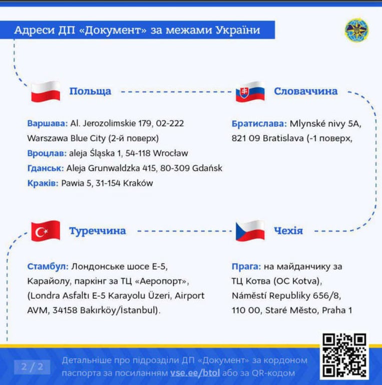 Минреинтеграции опубликовало адреса в каждой из стран. В частности, на днях открылся первый офис ГП "Документ" в Берлине (адрес: Am Treptower Park 14, 12435 Berlin, этаж 2).