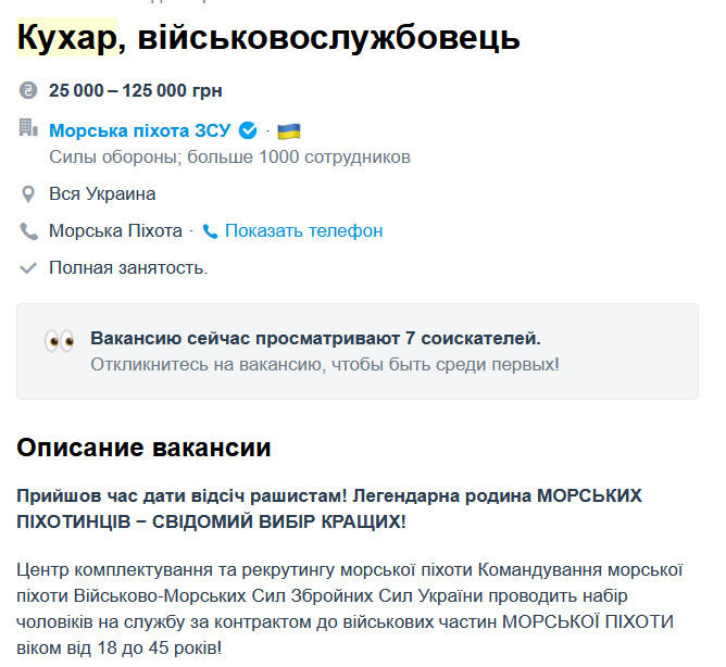 Также Морская пехота ВСУ предлагает работу поварам с заработной платой 25 тыс. — 125 тыс. грн. Обещают дополнительное вознаграждение за выполнение задач на первой линии обороны — 100 тыс. грн.