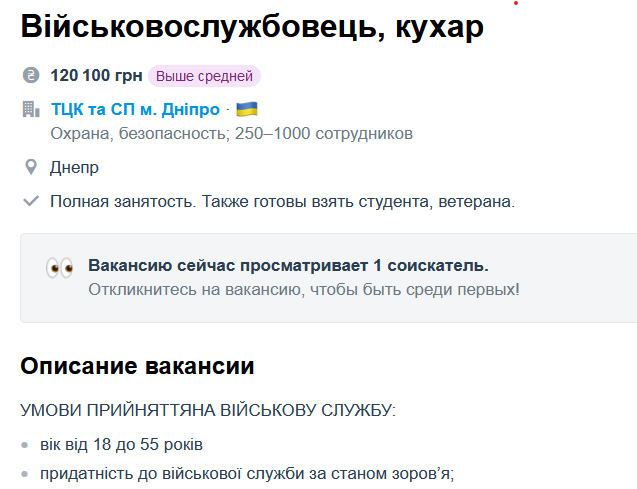 Так, в частности, поваров приглашают в город Днепр на военную службу. Среди условий — полная занятость, возраст 18-55 лет, пригодность к военной службе по состоянию здоровья. Также готовы принять на работу студентов или ветеранов. Заработная плата может достигать 120 тыс. гривен.