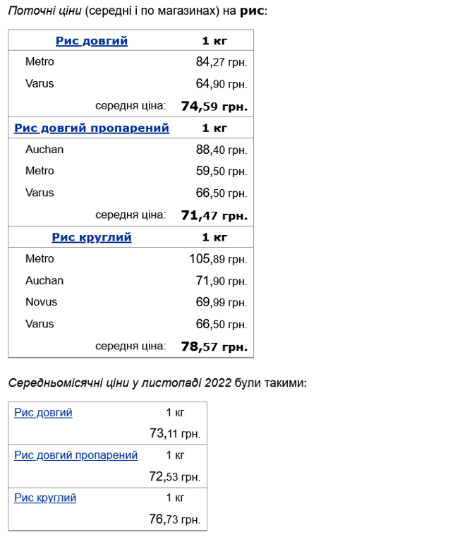 У грудні, як і в попередні місяці, продовжував дорожчати рис. Зараз один кілограм круглого рису у середньому коштує 78,57, що на 1,84 грн більше за середньомісячну ціну місяцем раніше. У листопаді такий вид рису продавали за 76,73 грн, а в жовтні — за 74,85 грн.